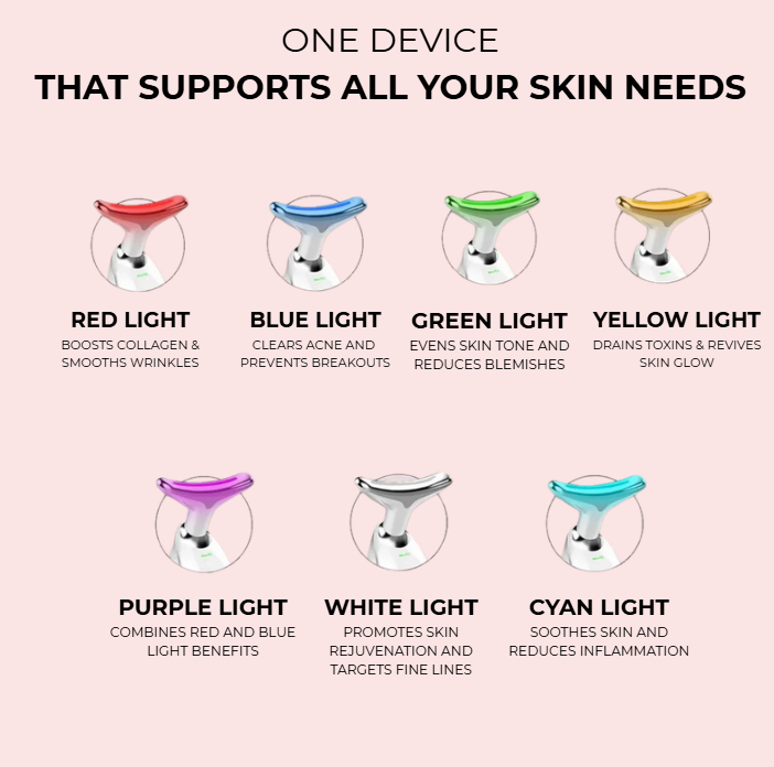 - 7-Color LED Technology: A multifunctional massage tool that targets specific needs for both the face and neck for a customized skincare experience.